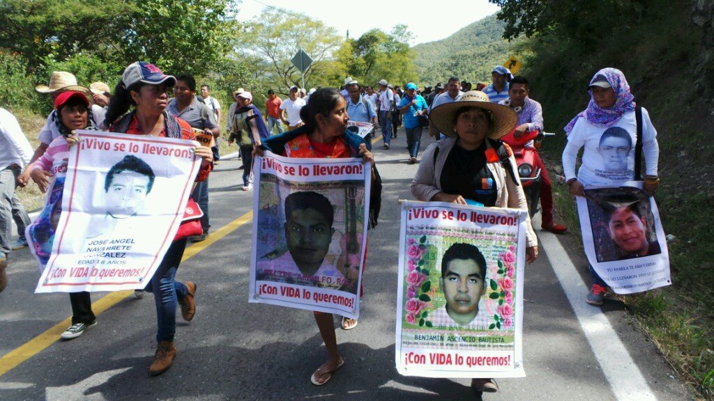 Padres de familia de los 43 normalistas desaparecidos en Iguala el año pasado y estudiantes de la Normal Rural de Ayotzinapa realizaron ayer una marcha desde su escuela, ubicada cerca de Tixtla, hasta el palacio de gobierno.