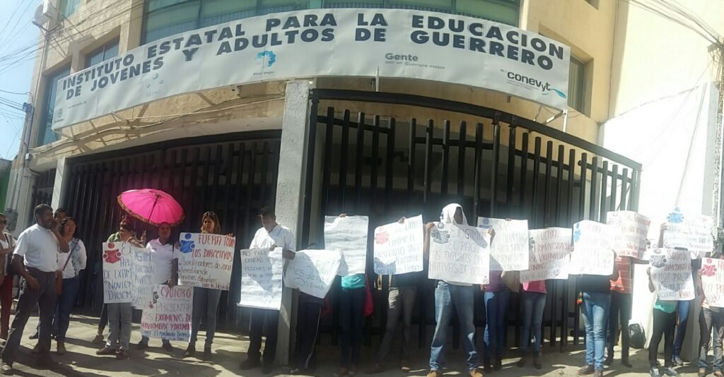 Las protestas por parte del personal y las figuras solidarias del Instituto Estatal para la Educación de los Jóvenes y Adultos de Guerrero (IEEJAG) continuaron este miércoles, debido a que el nuevo director Jorge Salgado Parra alega que no tiene recursos para que se apliquen los exámenes de noviembre y diciembre.