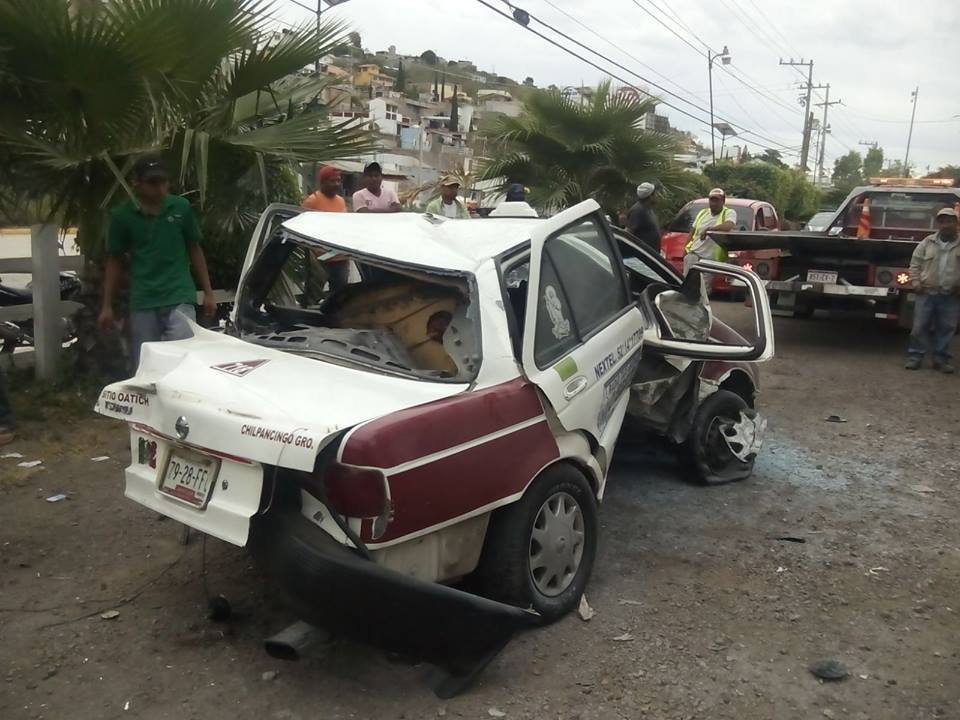 Paramédicos de la Cruz Roja y elementos policiacos se trasladaron al lugar y encontraron dos vehículos con daños mayores. El primero se trataba de un taxi de la marca Nissan, tipo Tsuru, con número económico 718 y placas de circulación 79-28-FFC del estado de Guerrero, en donde viajaba el conductor, el cual quedó prensado y herido de gravedad.
