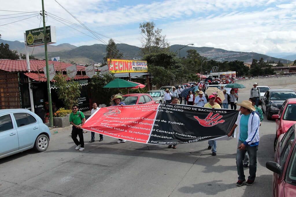 A la protesta de los trabajadores de Bachilleres se sumaron integrantes del Frente de Defensa Popular (FDP), quienes también pidieron seguridad para las comunidades donde tiene presencia su organización, libertad de presos políticos y la presentación con vida de los 43 normalistas de Ayotzinapa, desaparecidos en Iguala el 26 de septiembre del 2014.