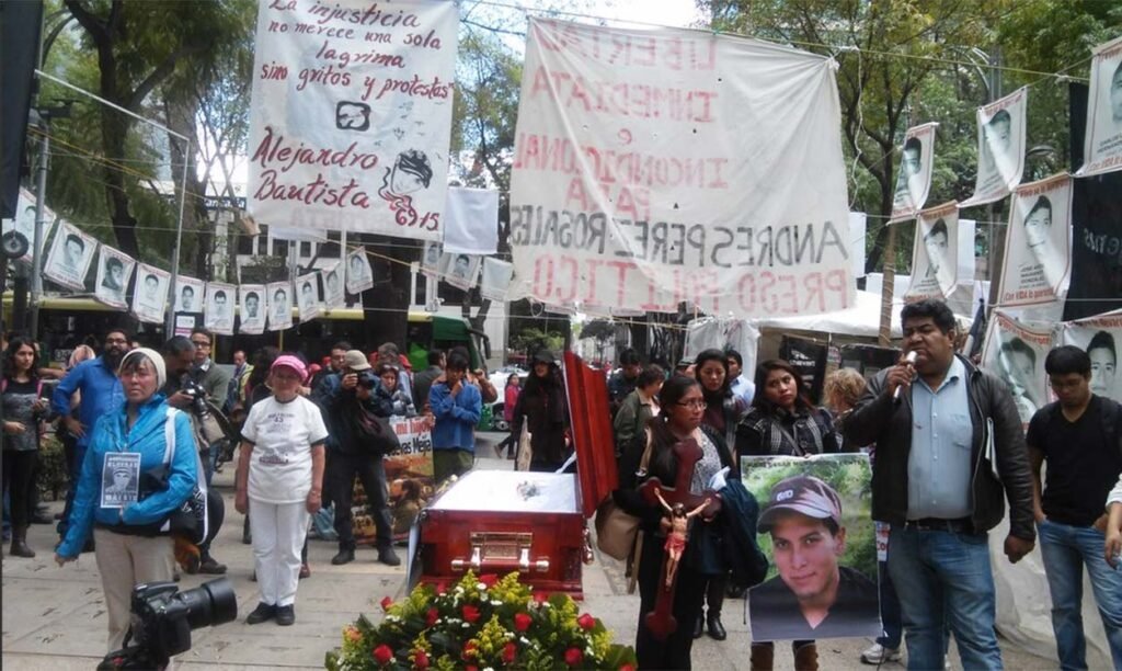 Durante la marcha, familiares y normalistas realizaron un funeral simbólico frente a las oficinas de PGR, en Paseo de la Reforma, donde colocaron un ataúd vacío en memoria de Julio César Mondragón. (Agencias)