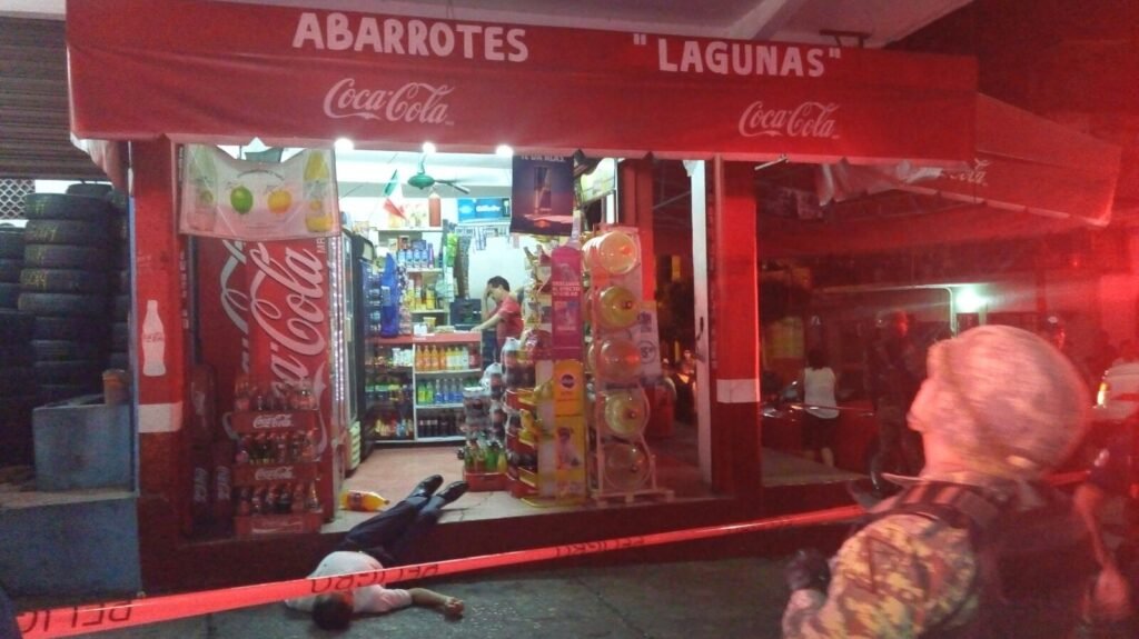 Elementos policiacos de los tres niveles del gobierno se trasladaron al lugar, hallando los cadáveres de dos hombres en el interior del local de abarrotes “Lagunas”.