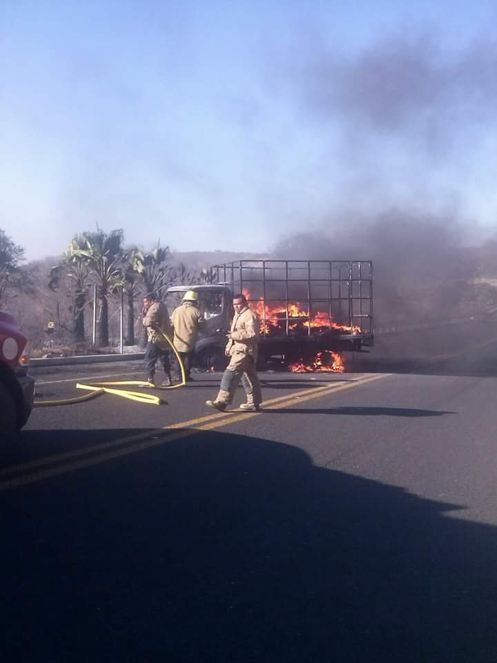 Elementos de Protección Civil municipal y el Heroico Cuerpo de Bomberos se trasladaron al lugar, y encontraron un camión blanco, marca Hino, sin placas de circulación, cargado de neumáticos, de la empresa con razón social “Renovadora y Distribuidora Atlas”, el cual estaba prácticamente cubierto por las llamas, por lo cual, de inmediato, se dieron a la tarea de sofocar el siniestro.