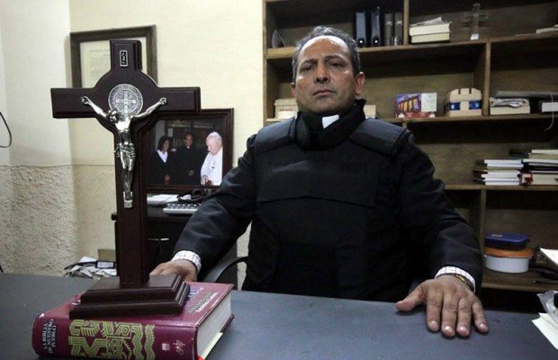 López Gerónimo es todo, menos un sacerdote ortodoxo. Su nombre y su rostro se hicieron famosos gracias a una fotografía publicada en enero de 2014 que llegó hasta El Vaticano. En ella se ve su rostro enérgico, firme. A su costado derecho, una cruz de madera con un Cristo de plata. Sobre su sotana negra, un chaleco antibalas del mismo color.