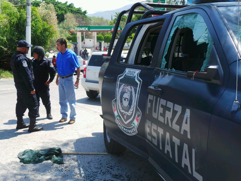 Fue cerca de las 10:30 horas cuando mediante un reporte policiaco se informó que los normalistas de Ayotzinapa destruyeron la patrulla 0227 de la Policía Estatal, placas HE-39-553, que estaba en un filtro de seguridad en el sitio antes mencionado de Tixtla y, además, retuvieron a un policía estatal que fue golpeado y liberado a las 11:00 horas.