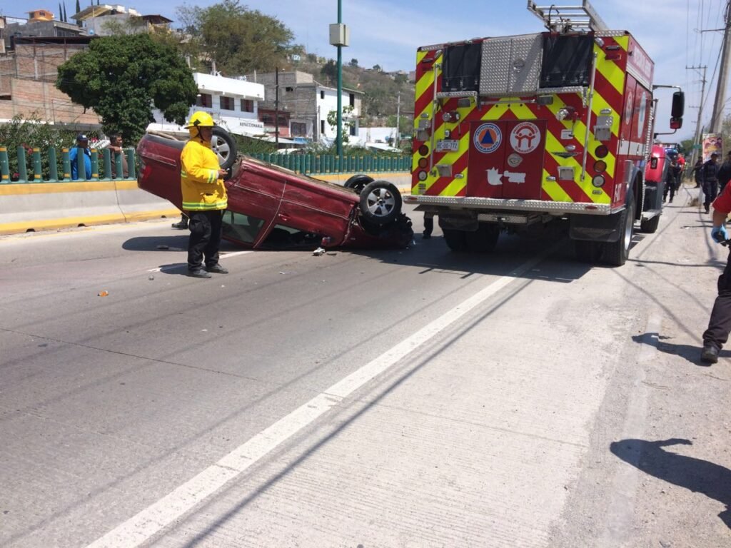 Paramédicos de la Cruz Roja llegaron al lugar y encontraron un Jetta de color rojo, con placas MNN5511 del estado de México, que estaba totalmente volteado justo en medio de la carretera, lo que provocó caos vehicular.