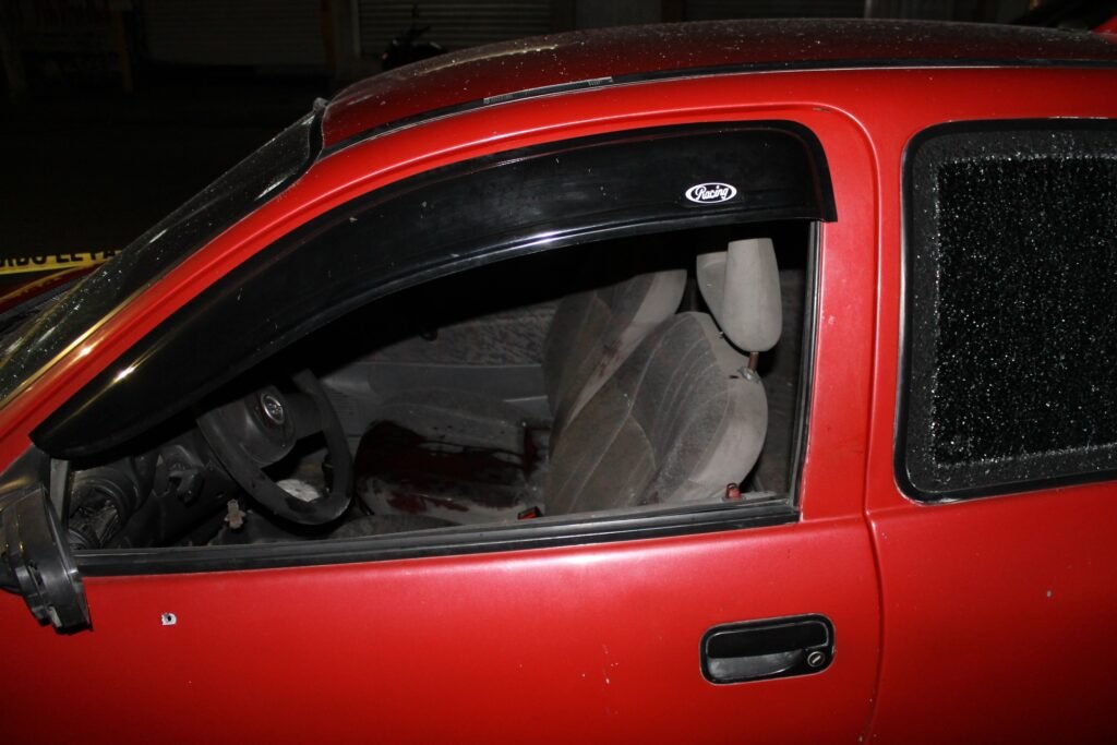 La madrugada de ayer fue encontrado un vehículo rojo de la marca Chevrolet, tipo Chevy, con plazas HFA-7618 del estado de Guerrero, abandonado sobre la avenida Guerrero, casi esquina con la calle SCT, de la colonia Ruffo Figueroa, y con decenas de impactos de arma de fuego de calibre AK-47 y R-15.