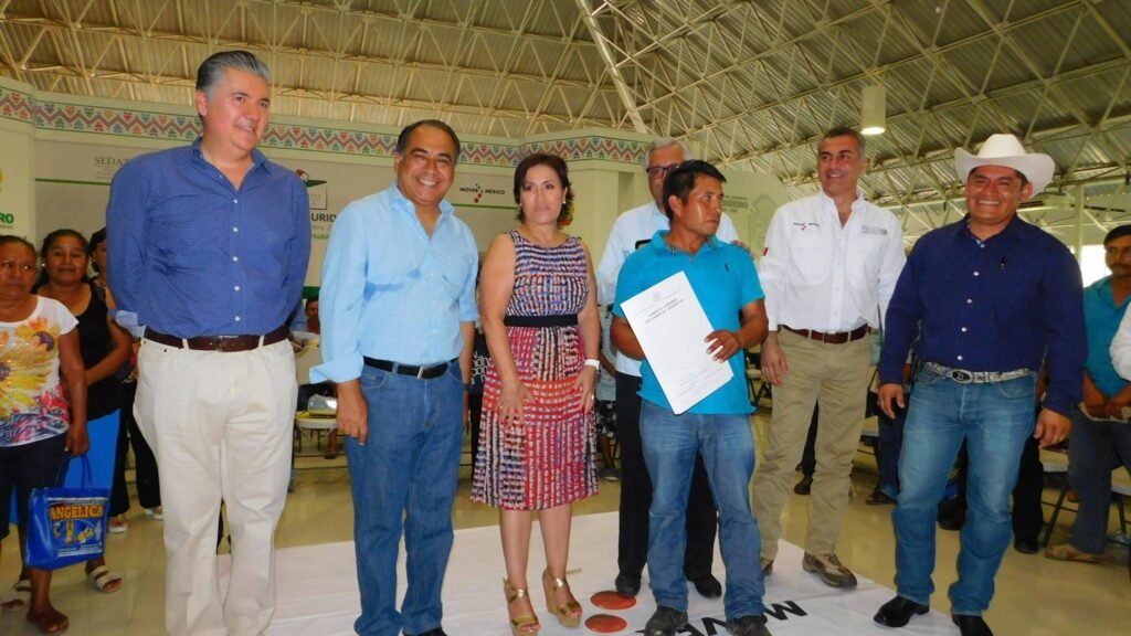 Durante su discurso en el evento, destacó que entregaron escrituras de sus terrenos a más de 400 ejidatarios que ahora “tienen la tranquilidad de que un conflicto de 65 años se ha resuelto, porque esa es la instrucción que tenemos del presidente de la República, Enrique Peña Nieto, que haya justicia social para la gente que menos tiene”.