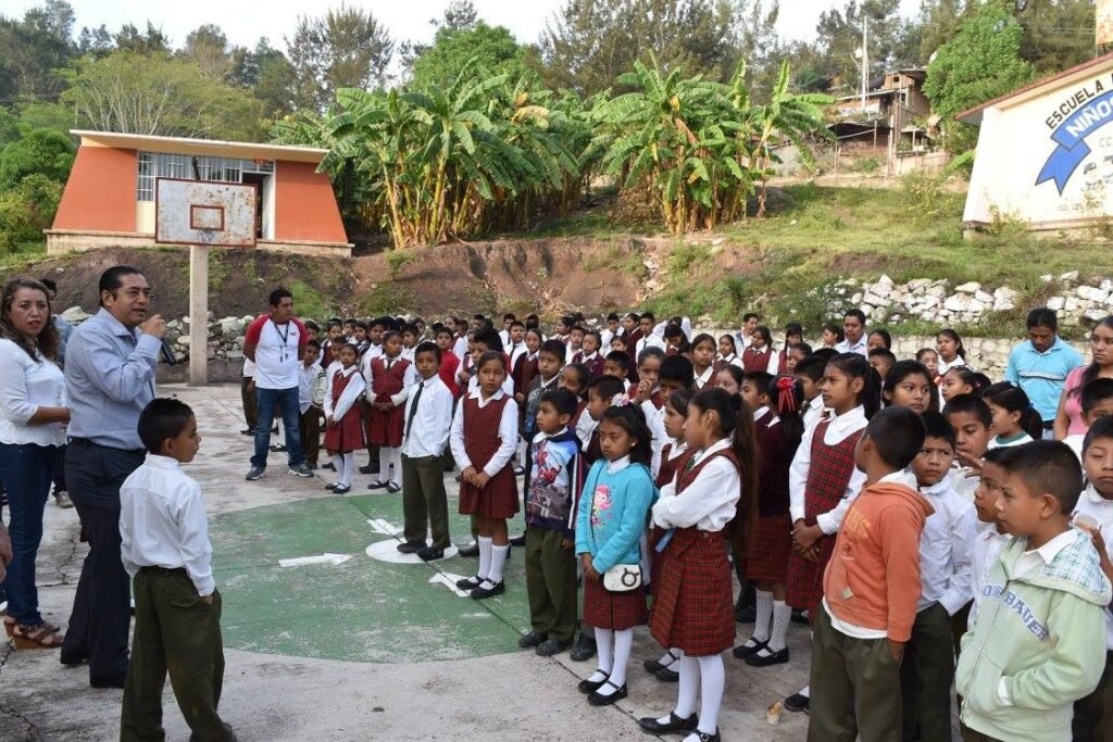 * Este martes dio inicio a la construcción del techado para la cancha de basquetbol y entregó material para la construcción del muro perimetral en una primaria