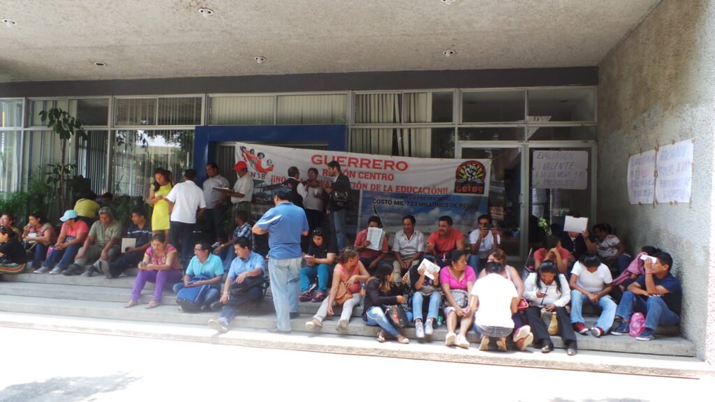 Posteriormente, los profesores tomaron el edificio y bloquearon la esquina de las calles 16 de septiembre e Ignacio Zaragoza, lugares donde colocaron lonas y cartulinas con mensajes como: “evaluación urgente a de la Vega y al presidente”, “si hay que evaluar por Peña, Nuño, Astudillo y de la Vega hay que empezar” y “evaluación primero a los hijos de funcionarios de Guerrero”, entre otros mensajes.