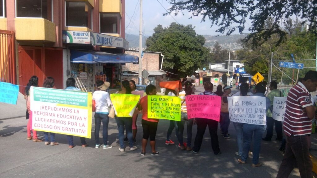Padres de familia y docentes de al menos 16 instituciones educativas de nivel básico, bloquearon de manera simultánea vialidades en diversos puntos de la capital del estado para manifestarse en apoyo a los profesores que están en contra de la Reforma Educativa y de la Evaluación Docente.