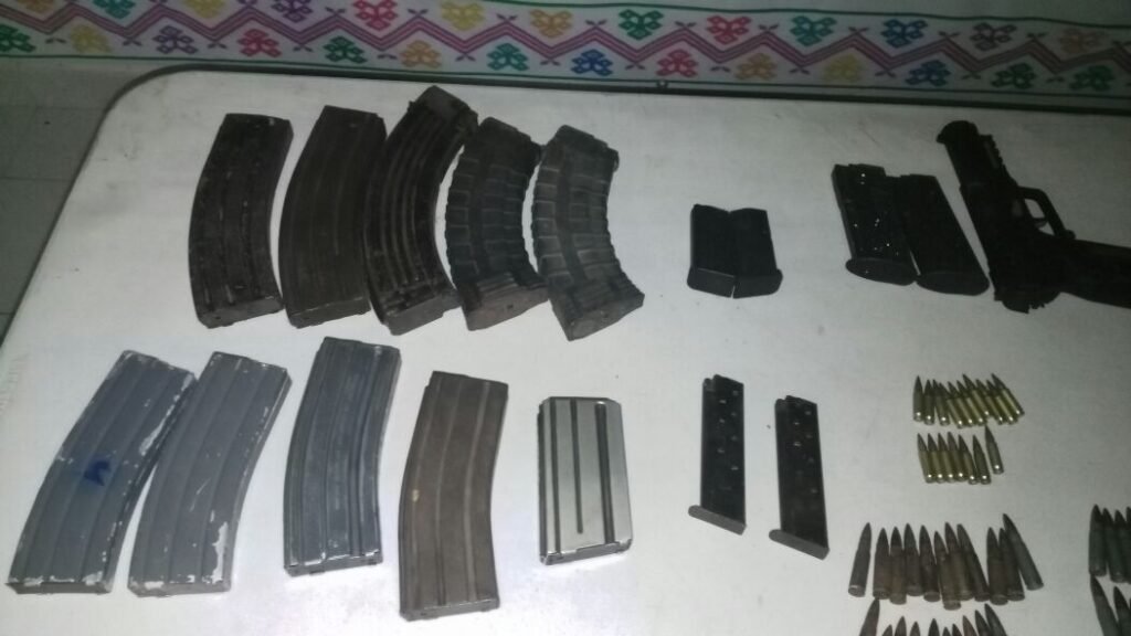 Además, también encontraron equipo táctico como 3 cartucheras de piel para cargador arma corta; 3 cartucheras para cargador de fusil; 3 fundas para pistola escuadra; 2 pasamontañas y 2 básculas.