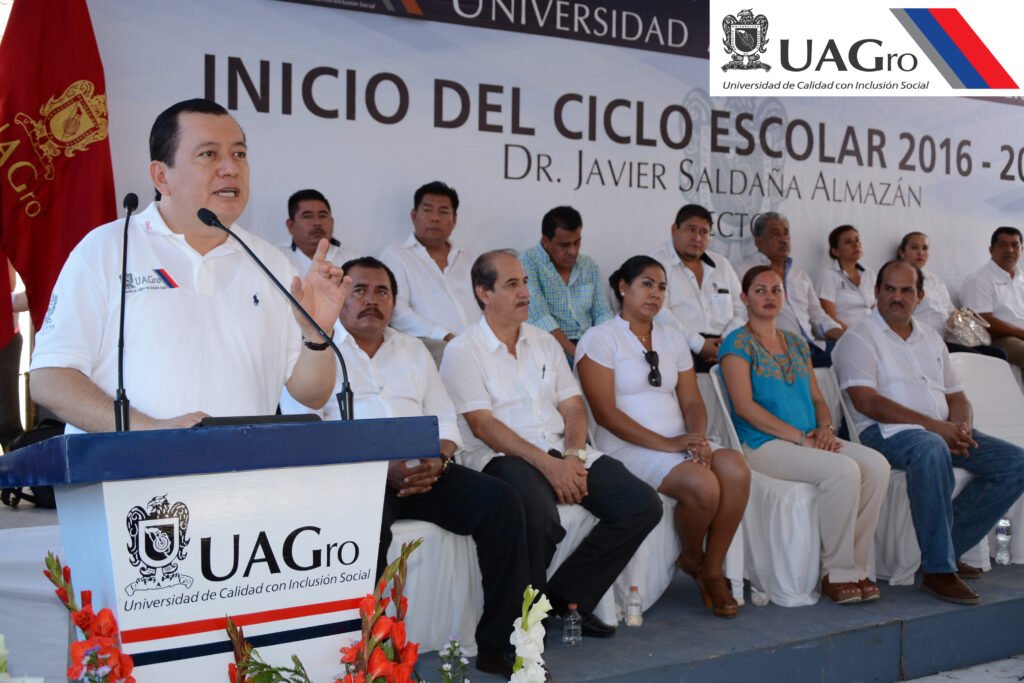 PETATLÁN.— Con la presencia de estudiantes, padres de familia, presidentes municipales, directores y directivos de Nivel Medio y Superior de la Costa Grande, el rector de la Universidad Autónoma de Guerrero, Javier Saldaña Almazán dio inicio de manera oficial el ciclo escolar 2016-2017 en la Escuela Preparatoria No. 25 de Petatlán, donde convocó a los universitarios a “redoblar esfuerzos por el futuro de la juventud guerrerense”.