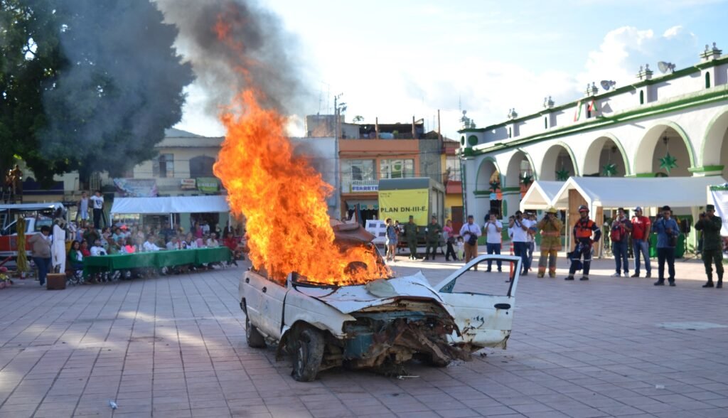 También realizaron una extracción de una persona atrapada en un vehículo en peligro de explosión y finalmente una demostración de cómo sofocar un incendio de un vehículo.