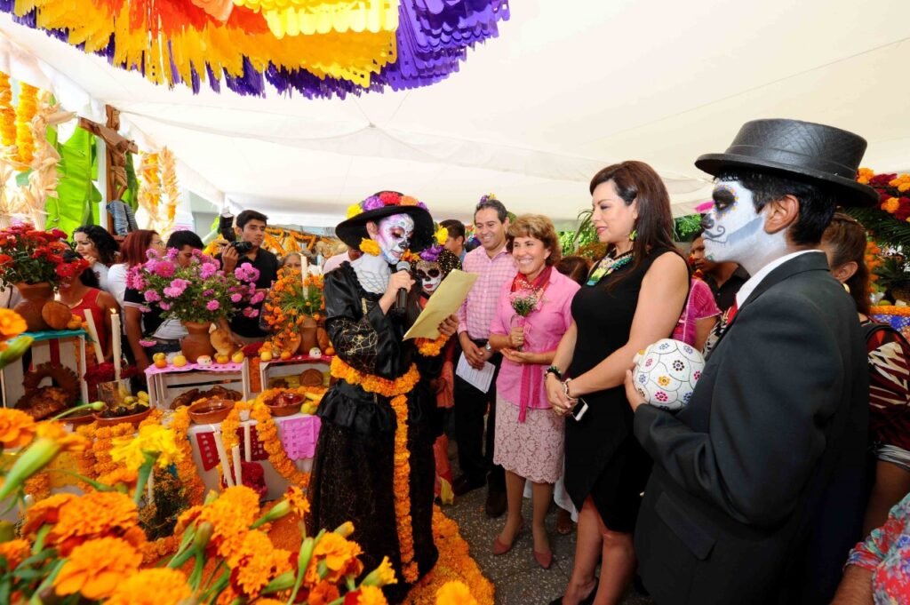 Mercedes Calvo, acompañada del jurado calificador, recorrió cada uno de los stands que fueron decorados con flor de terciopelo, cempasúchil, incienso, velas, frutas como jícama, mandarina, piña, pan y diferentes comidas, de acuerdo a las tradiciones de las diversas regiones del estado.
