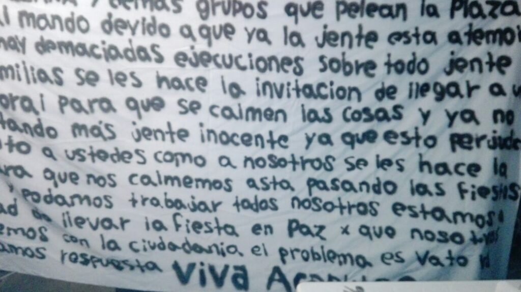ACAPULCO. — Personas desconocidas colocaron una narco-manta con un mensaje en la cual señalan que les piden tregua para no seguir asesinando a más personas inocentes, precisamente en el puente peatonal de la avenida Cuauhtémoc.