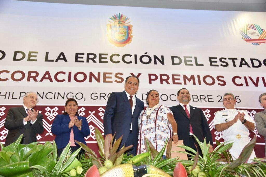 A nombre de los premiados al Mérito Civil, Alba Teresa Estrada Castañón dedicó la presea “a los luchadores sociales de Guerrero, a los defensores de derechos humanos y familiares de los 43 desaparecidos de Ayotzinapa”, porque “como estudiosa de los movimientos sociales veo una contribución inapreciable para alcanzar la justicia y lograr el resurgimiento cívico de nuestro querido estado de Guerrero, aquí surgió de la lucha y el sacrificio de hombres y mujeres patriotas que en la Independencia y la Revolución hicieron un aporte a la constitución del país”.
