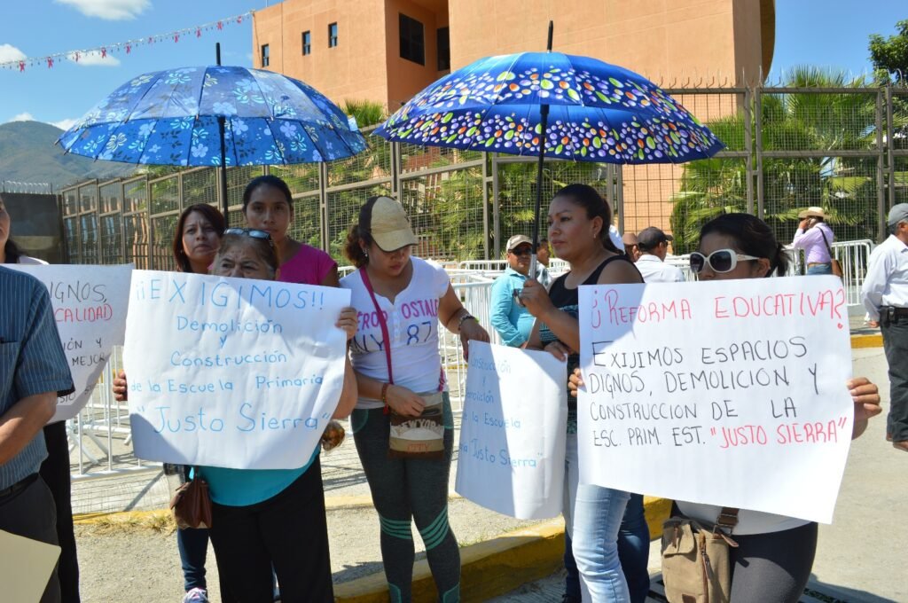 Padres de familia y maestros de la escuela primaria “Justo Sierra” de esta capital, protestaron afuera del palacio de gobierno para exigir la demolición y reconstrucción de su inmueble que se encuentra en pésimas condiciones.