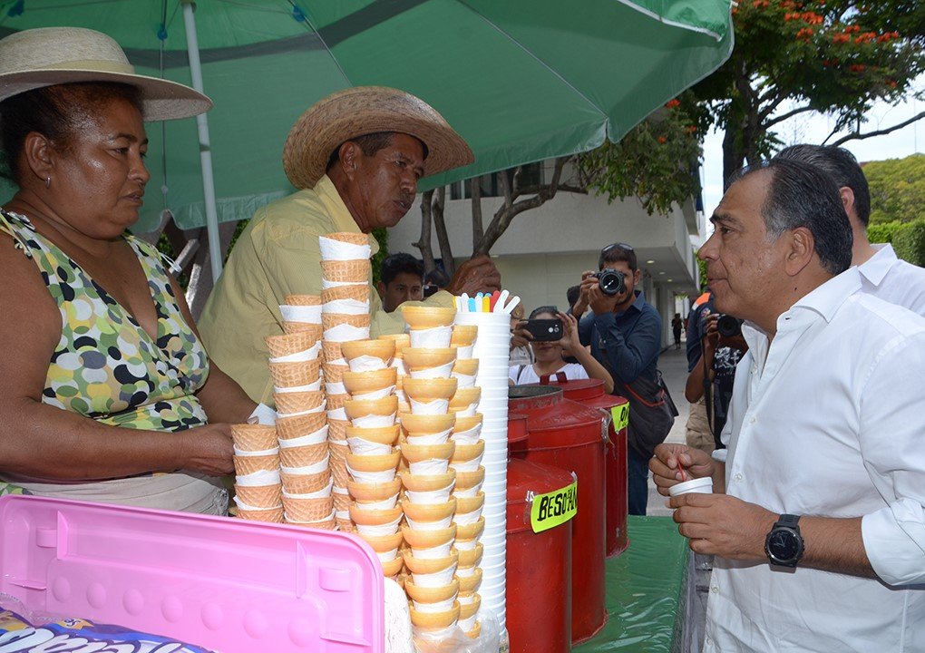 Ahora en la plancha del Zócalo se colocó un tianguis de artesanías guerrerenses y Astudillo Flores recorrió los negocios acompañado del alcalde Marco Antonio Leyva Mena, y en declaraciones a reporteros aceptó que el sábado se reunió con dirigentes del FUSDEG.