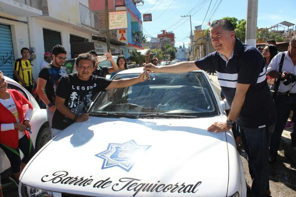 Acompañado por el secretario de Seguridad Pública, Esteban Espinoza Montoya, el presidente del barrio de Tequicorral, Miguel Ángel Cerro Vargas, así como vecinos del lugar, el alcalde capitalino entregó un automóvil de proximidad para reforzar la seguridad a través de rondines de vigilancia, al igual que ya se hizo en los barrios de San Mateo y San Antonio.
