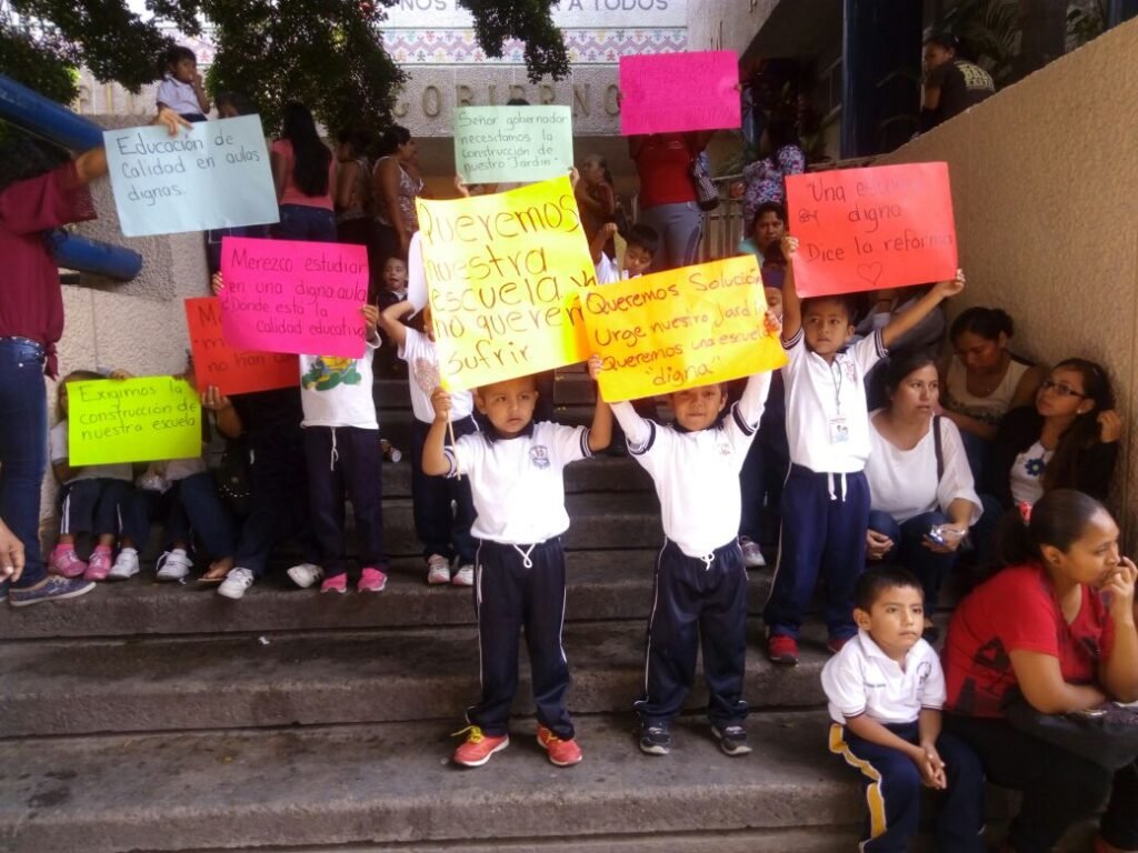 Maestros, padres de familia y alumnos del jardín de niños “Leonor López Orellana”, protestaron la mañana de este lunes en el edificio “Juan Álvarez”, donde se encuentran las oficinas de Finanzas del estado, porque desde hace más de un año se les prometió la reconstrucción de su plantel pero hasta el momento no se ha concretado.
