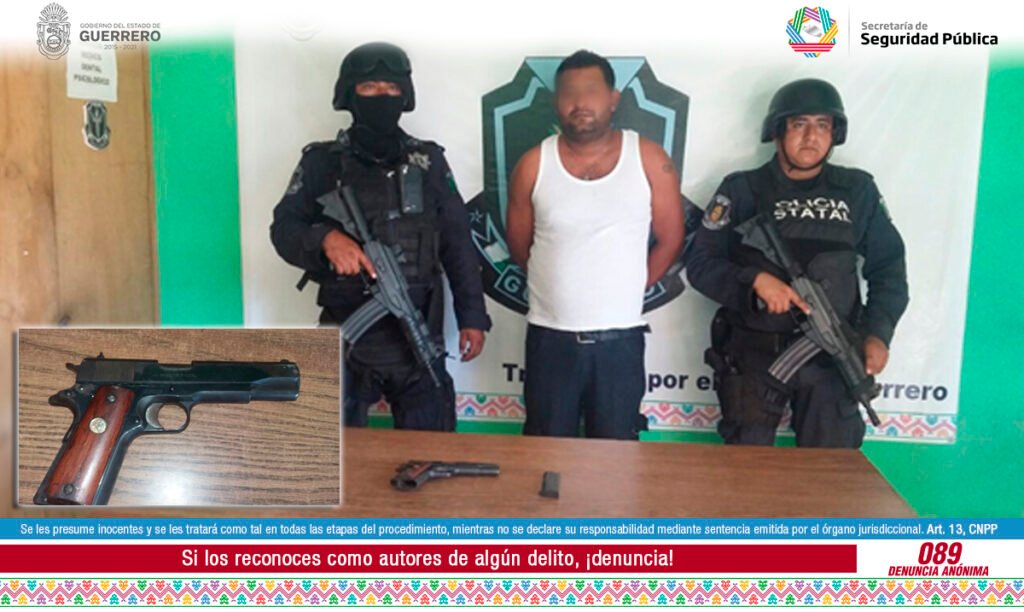 De inmediato, elementos de la BOM se trasladaron al lugar y encontraron a José Guadalupe “N” de 32 años de edad, el cual, al versos intentó darse a la fuga, motivo por lo que se le realizó una revisión de rutina, localizándole fajada en la cintura una pistola tipo escuadra, calibre .45, marca Colt Government Mk IV, serie 80, número de matrícula CCPD139 y un cargador metálico desabastecido.
