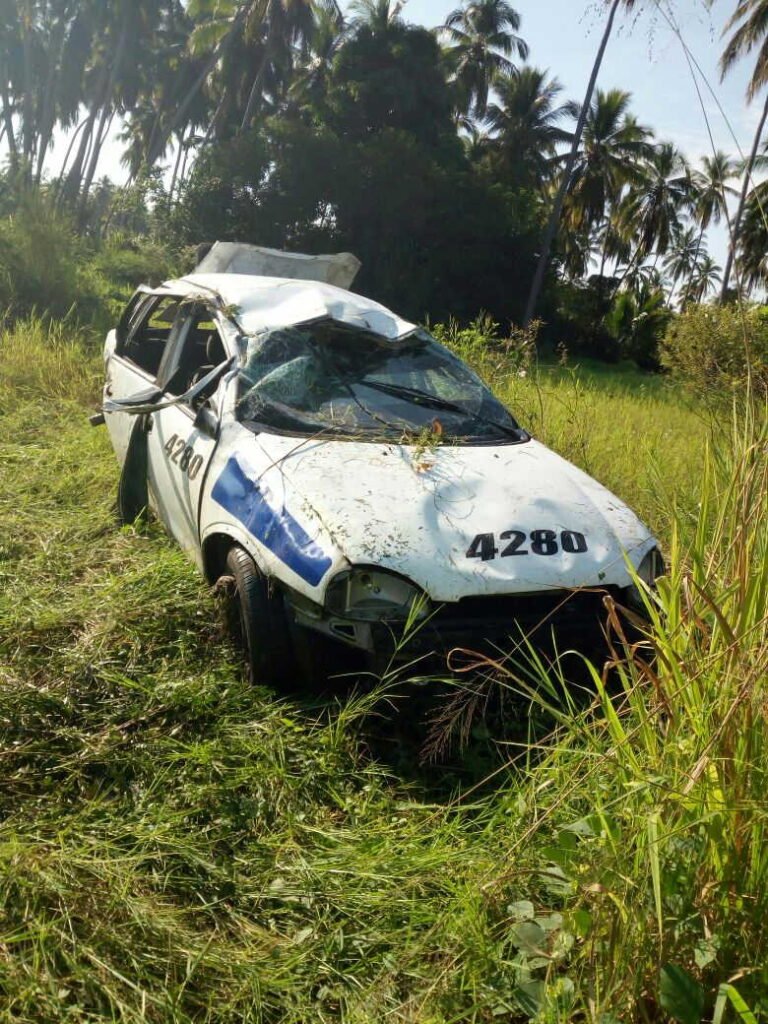 El percance ocurrió a las 09:30 horas de este domingo, sobre esta vía de comunicación, y de acuerdo a las versiones de las autoridades, al parecer el auto Chevy, habilitado como taxi, de color blanco, con franjas anchas a los costados, de color azul rey, número 4280, sin placas, sufrió una ponchadura en una llanta, lo que provocó que se saliera de la cinta asfáltica, dando muchas volteretas hasta quedar en sus propias llantas.