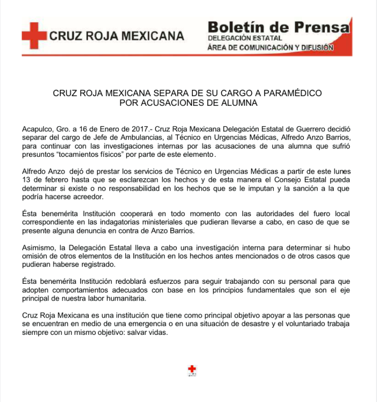 Según el portal Noticias Acapulco New, los cuales cuentan con copias de las denuncias escritas entregadas al administrador de la Cruz Roja, las tres afectadas, después de terminar con su curso para ejercer como paramédico, comenzaron a un periodo de servicio social en la institución, sin pago alguno.