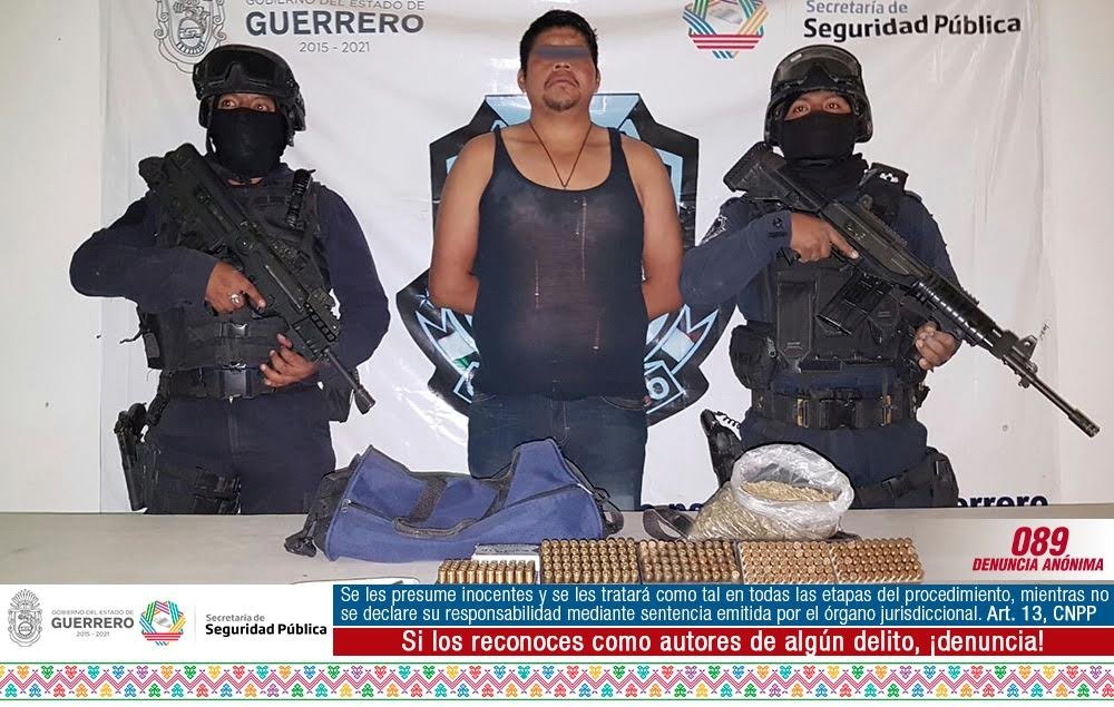 Un sujeto que llevaba marihuana y cientos de cartuchos útiles para armas de diversos calibres, fue detenido por elementos de la Policía Estatal en la comunidad de Mayanalán, perteneciente al municipio de Tepecoacuilco, en la Región Norte del Estado.
