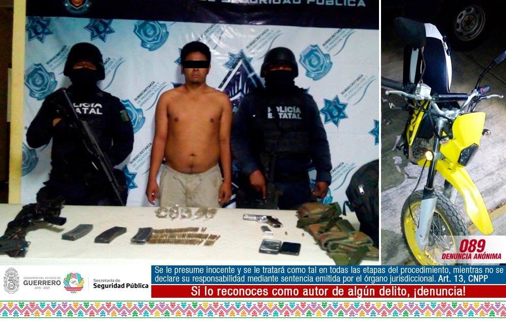 Policías estatales y efectivos castrenses de la Base de Operaciones Mixtas (BOM) detuvieron a un hombre que portaba armas, droga y una motocicleta con reporte de robo en una calle de terracería de la comunidad de Las Pozas, en el municipio de Zihuatanejo.
