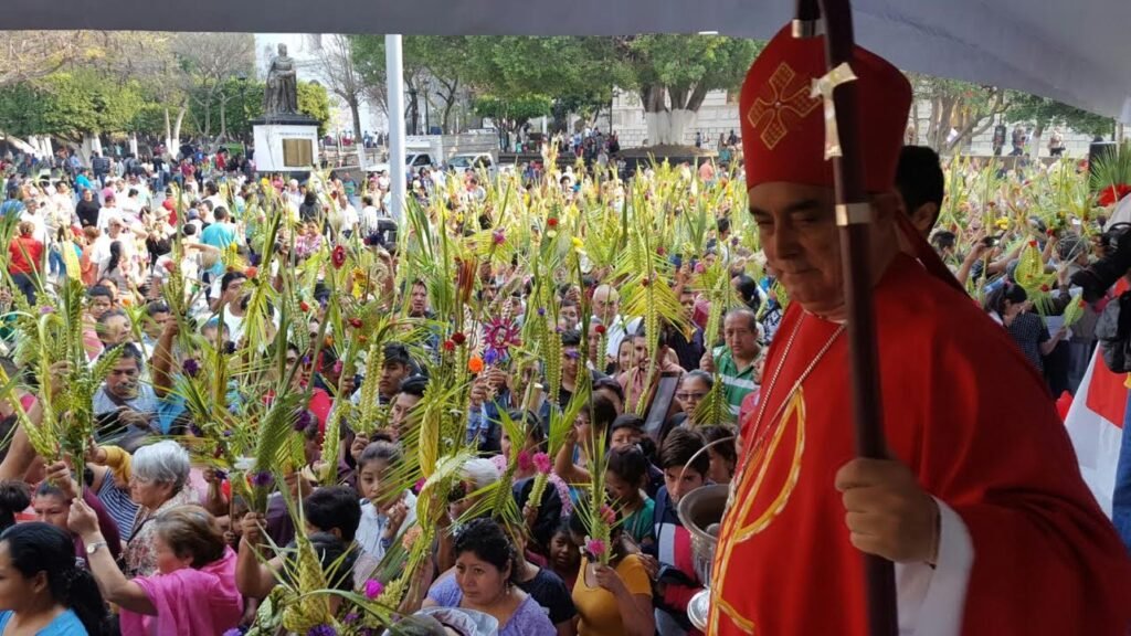 El jerarca católico encabezó en la Plaza Cívica de esta capital la homilía del Domingo de Ramos con el que se inicia la celebración de Semana Santa a la que asistieron centenares de feligreses católicos de esta capital.