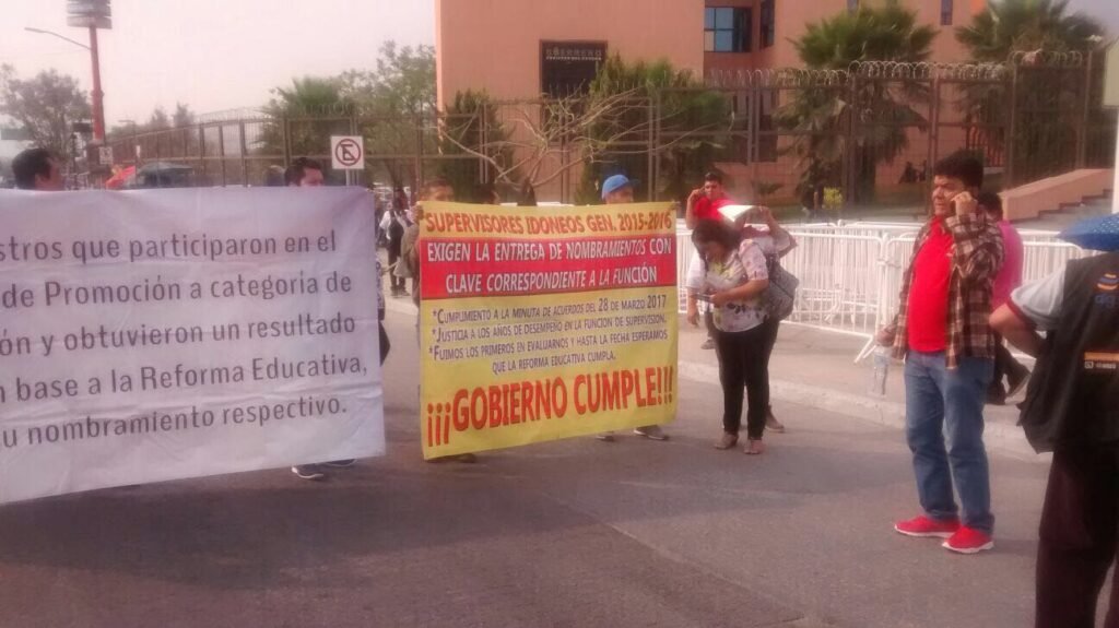 Maestros que fueron sometidos a evaluación por el Servicio Profesional Docente y que lograron obtener el resultado de “idóneos” realizaron una protesta este lunes con un bloqueo frente al palacio de gobierno, en reclamo de la asignación de 56 nombramientos de supervisores de zona escolar.