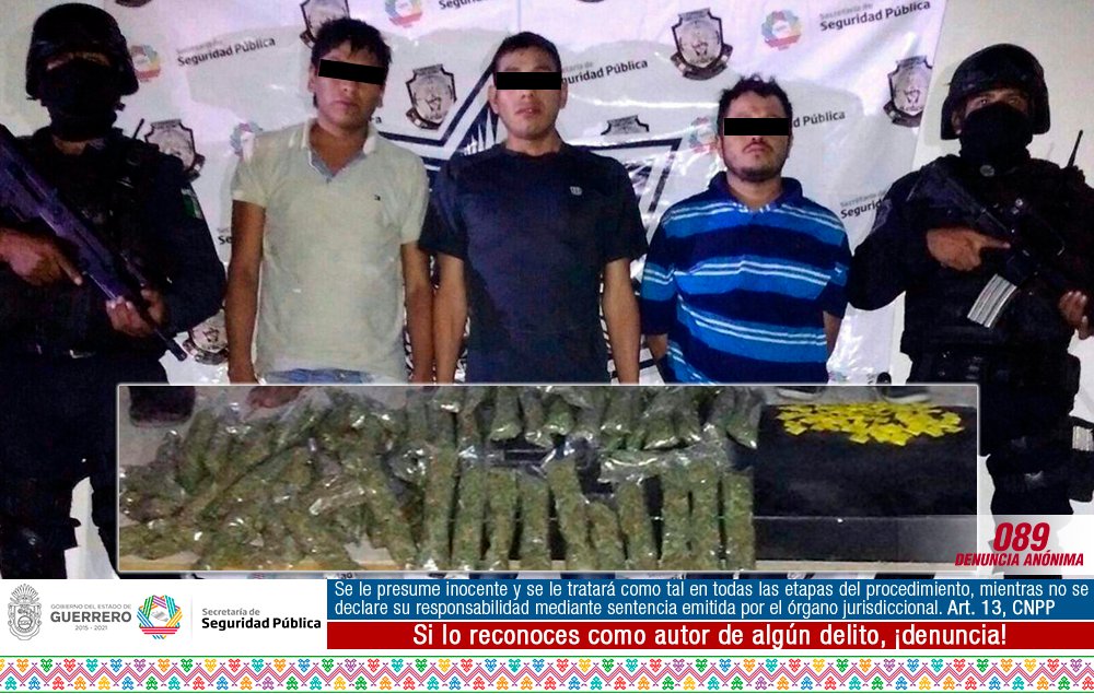 Elementos de la Policía Estatal detuvieron a tres sujetos que portaban droga y supuestamente la vendían en un domicilio particular ubicado en la calle Lorenzo Barcelata esquina con Guty Cárdenas, en la colonia Los Ángeles.
