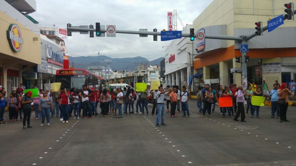 ACAPULCO.— Estudiantes del Frente Estatal de Preparatorias Populares del Estado de Guerrero bloquearon la avenida Cuauhtémoc y posteriormente la costera Miguel Alemán, a la altura del Zócalo, para exigir becas, construcción de aulas y otras demandas incumplidas por parte del Ayuntamiento de Acapulco.