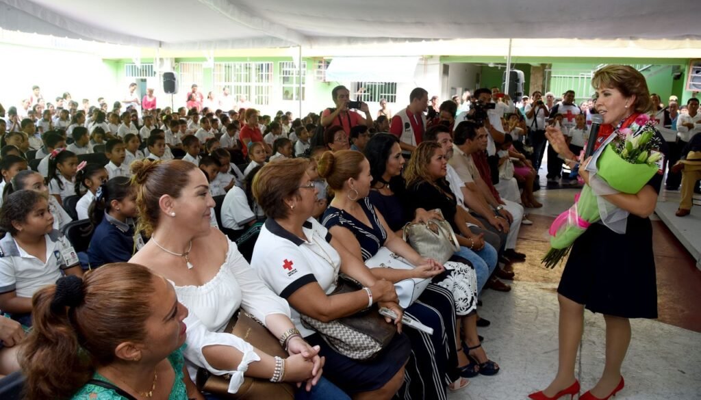 ATOYAC.— La presidenta del DIF Guerrero, Mercedes Calvo, puso en marcha la Colecta Escolar de Cruz Roja en la Primaria Juan Álvarez en Atoyac y recibió la donación de un terreno para la construcción de la Cruz Roja en la misma localidad.
