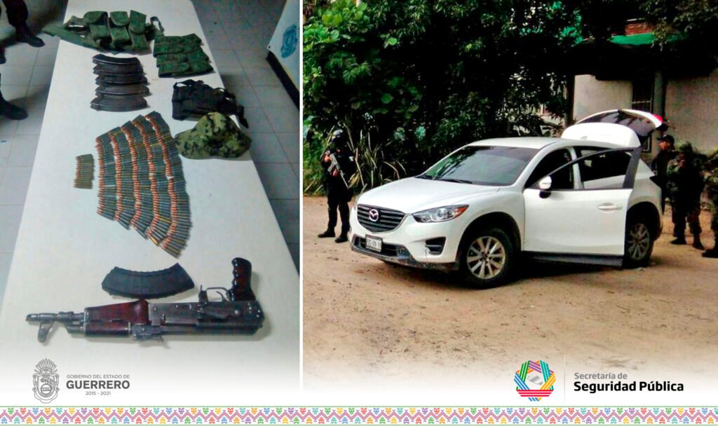 Policías estatales y efectivos castrenses aseguraron un vehículo, un fusil de asalto, cargadores y cartuchos de uso exclusivo del Ejército, Armada y Fuerza Aérea en el poblado de Palos Blancos, municipio de Petatlán.