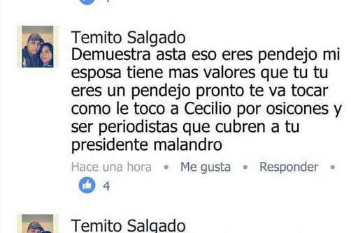 Con múltiples faltas de ortografía, “Temito Salgado” publicó en su cuenta de Facebook lo siguiente: “demuestra asta eso eres pendejo mi esposa tiene más valores que tu tu eres un pendejo pronto te va a tocar como le toco a Cecilio por osicones y ser periodistas que cubren a tu presidente malandro”.