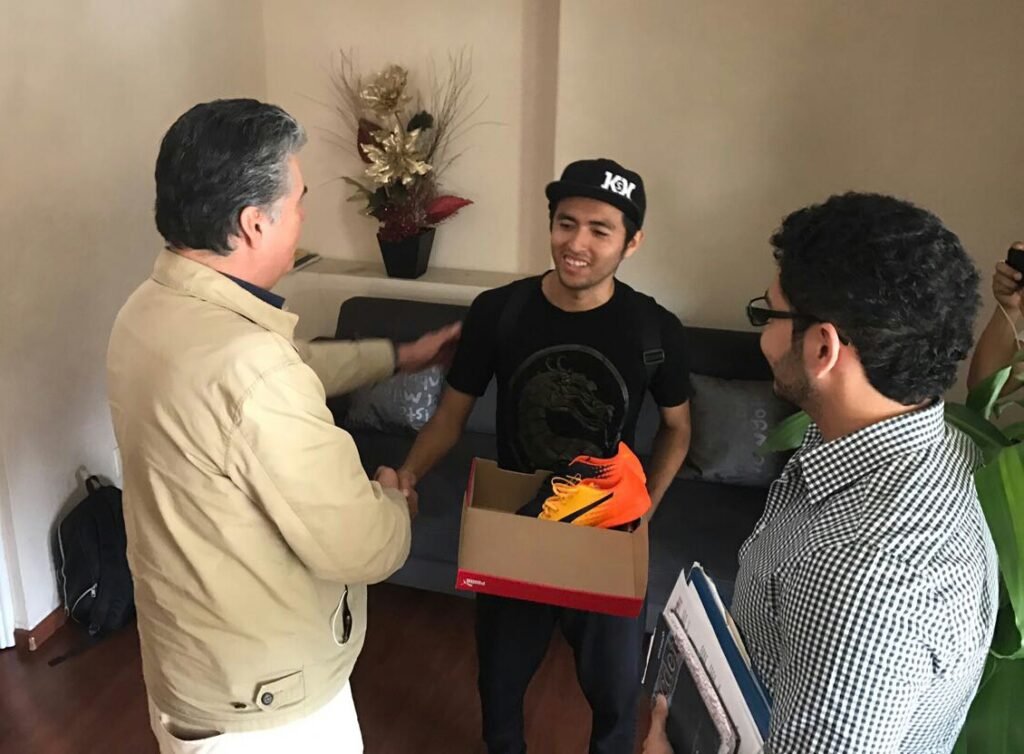 En oficinas del palacio municipal, el edil entregó apoyos al joven estudiante en licenciatura y talento deportivo en una nueva categoría “Freestyle Football”, quien quedó el año pasado en lugar 16 de 350 participantes, “el alcalde fue el único que me dio respuesta inmediata a la petición de un apoyo para la práctica del deporte, por lo que le agradezco que me haya apoyado con calzado, viáticos y me entregaran uniformes”, dijo Morales Aparicio.