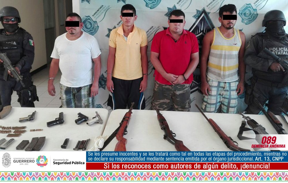 Los aprehendidos fueron identificados como Juan ‘N’ de 46 años de edad, Carlos ‘N’ de 31 años, Elbler ‘N’ de 25 y Elvis ‘N’ de 18. Tenían en su poder una granada de mano, ocho armas de fuego largas: una AK-47 calibre 7.62×39 milímetros, dos carabinas M2, calibre 30 milímetros, un fusil calibre 22 milímetros, tres escopetas calibre 16 milímetros y una escopeta calibre 12 milímetros.
