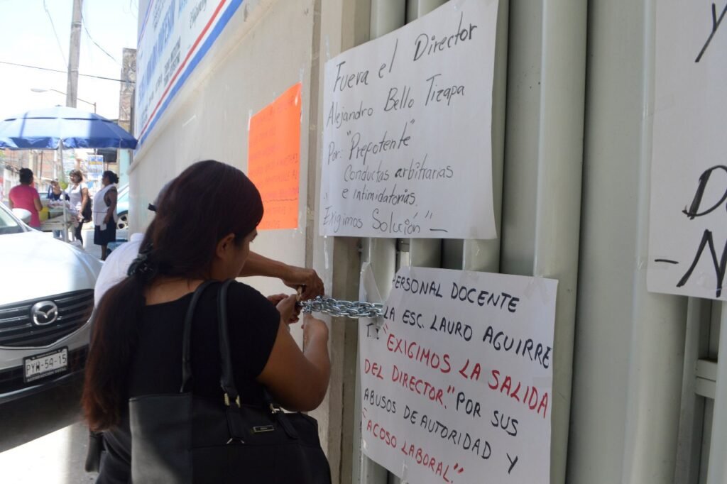 A una semana de que inicie el ciclo escolar, 2017-2018, personal docente de la escuela primaria “Lauro Aguirre”, del turno vespertino, se manifestó fuera de la institución para exigir la destitución del director, Alejandro Bello Tizapa, a quien acusan de prepotente, conductas intimidatorias, abuso de autoridad y acoso laboral.