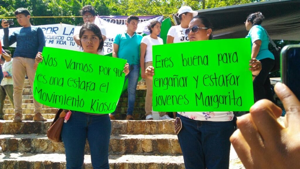 “Nos vamos porque es una estafa el Movimiento Kiosco”, “No crean en las falsas promesas de Margarita” y “Eres buena para engañar y estafar a jóvenes Margarita”, decían las pancartas que exhibieron los jóvenes.