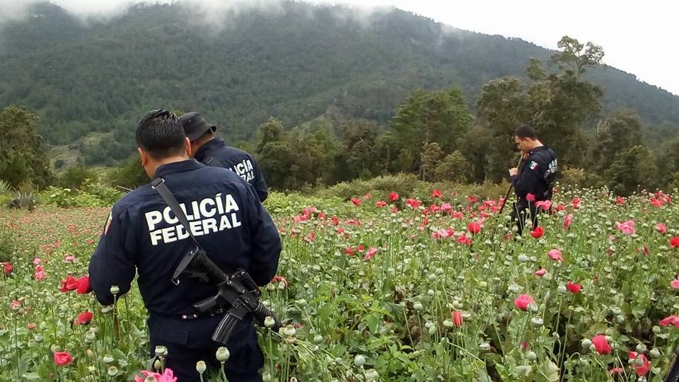 Elementos de la División de Fuerzas Federales de la Policía Federal localizó y destruyó seis plantíos con más de 59 millones de plantas de amapola, en la sierra de Tepoxtepec, Guerrero, municipio Chilpancingo.