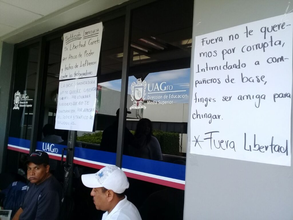 Este lunes, empleados de la Universidad Autónoma de Guerrero (UAGro), decidieron parar labores y bloquear una oficina en las instalaciones de Rectoría para solicitar la salida de la directora de Educación Superior, Libertad Sánchez Carreto, a quien acusaron de “prepotente, tráfico de influencias y déspota”.
