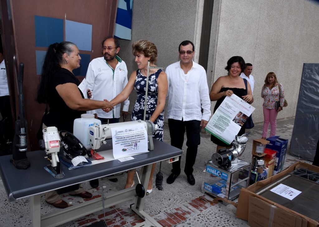 Acompañada por el secretario del Trabajo y Previsión Social, Oscar Rangel Miravete, se entregaron proyectos productivo de taller de costura a la señora, Margarita Rodríguez Juárez y Francisca Hernández Márquez; fuente de sodas La Güera, a María del Carmen Álvarez Salas y cocina económica, a Balbina Vázquez Franco y Edgar Hernández Vázquez.