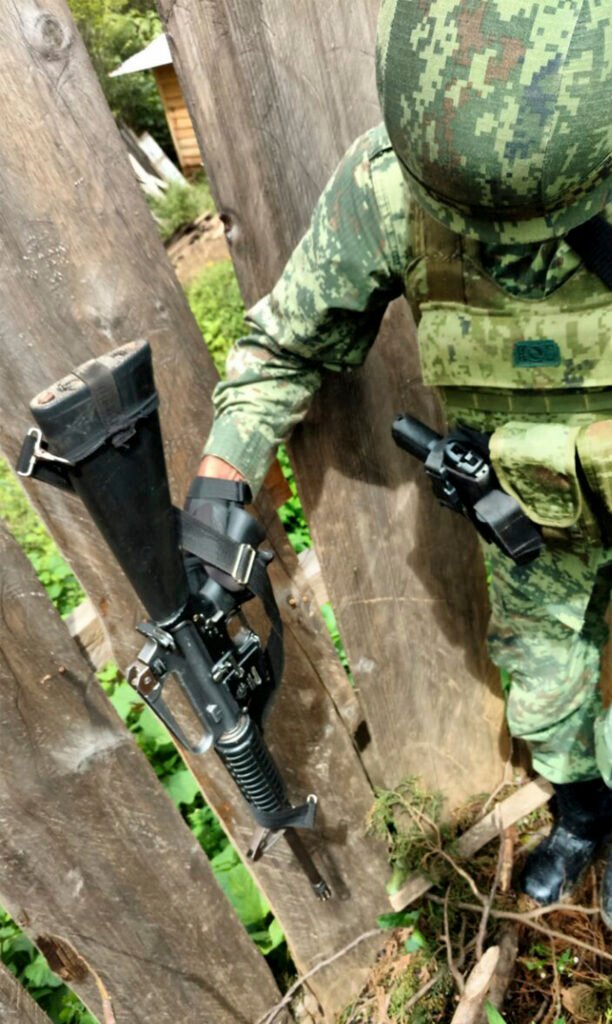 El personal policial y militar realizaba recorridos de seguridad a pie tierra, en las inmediaciones de la citada localidad, entre la cancha de basquetbol y una cerca de madera, localizó entre la maleza, el siguiente armamento: un fusil ligero AR-15, calibre 5.56mm de fabricación norteamericana, (Rock River Arms); un fusil AK-47, marca Norinco, modelo MAK-90.Sporter, calibre 7.62x39mm, hecho en China, con matrícula ilegible; 5 cargadores metálicos para fusil AK-47; 3 cargadores metálicos para fusil AR-15; 356 cartuchos útiles calibre 7.62x39mm, 89 cartuchos útiles calibre .223mm, así como una mochila de tela camuflada de desierto y una bolsa de tela color blanca.