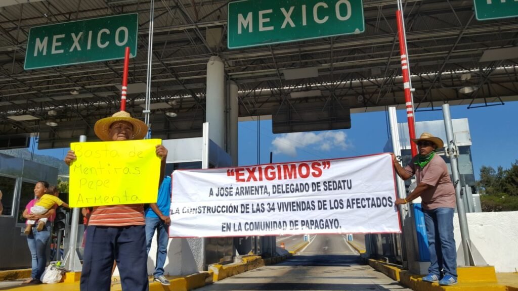 Trabajadores de la Secretaría de Desarrollo Agrario Territorial y Urbano (Sedatu) y damnificados por las tormentas “Ingrid” y “Manuel”, tomaron la caseta de Palo Blanco de la Autopista del Sol, para demandar el pago de salarios a los empleados de la dependencia para que se reanuden los trabajos de reconstrucción.