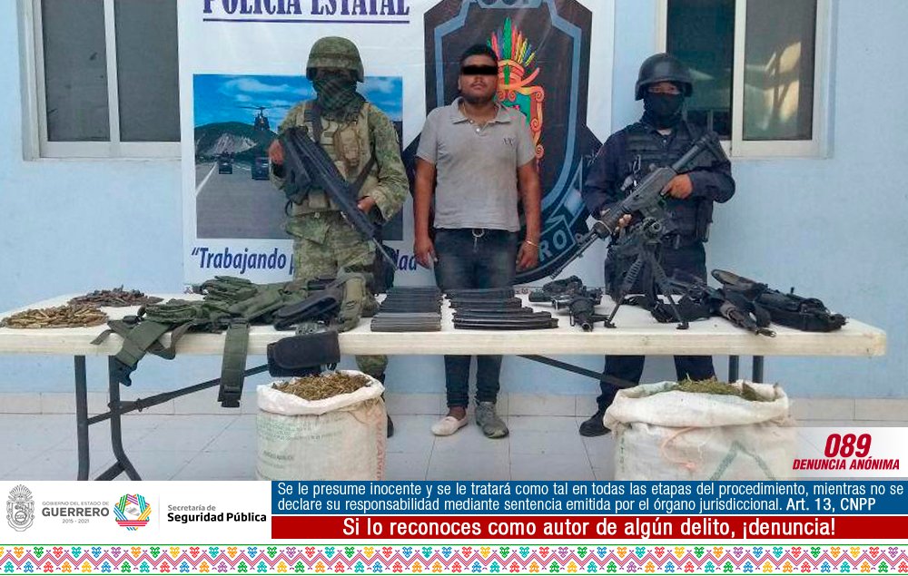 Elementos del Ejército Mexicano y de la Policía del Estado capturaron a dos hombres, entre ellos un menor de edad, en posesión de armas de uso exclusivo del Ejército Mexicano, cartuchos útiles, droga y dinero en el municipio de Coyuca de Catalán, región de la Tierra Caliente.