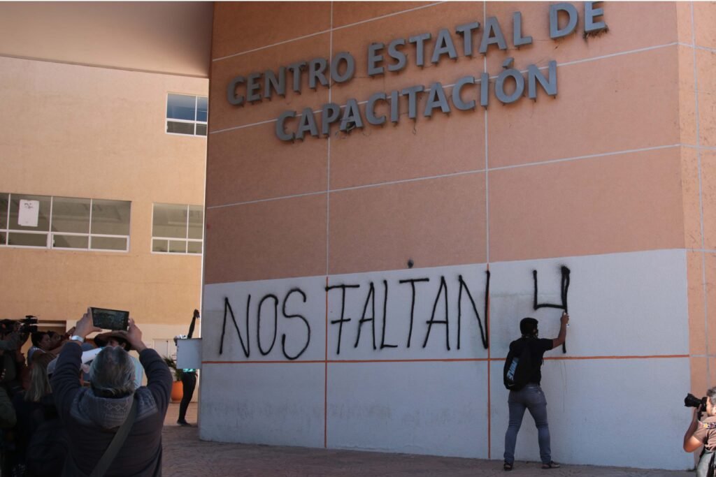 Los normalistas realizaron pintas en las paredes del Centro Estatal de Capacitación de la FGE en las que hacen referencia a la exigencia de presentación con vida de los 43 normalistas, y justicia para los familiares de las personas que perdieron la vida en esos hechos, así como para los lesionados por la agresión.