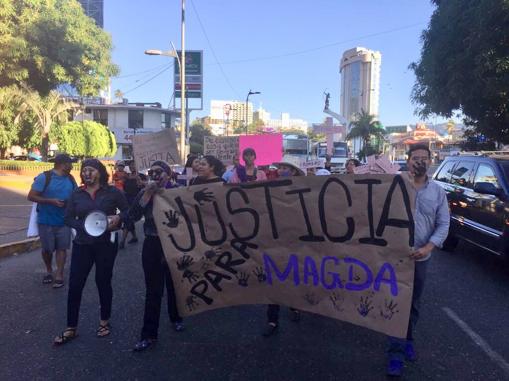 ACAPULCO.— Mujeres vestidas de negro y portando una cruz en sus manos, marcharon por la zona turística de este puerto para exigir justicia por el feminicidio de la nutrióloga Magdalena Aguilar, asesinada y desmembrada en Taxco, presuntamente por su exesposo quien continúa prófugo.