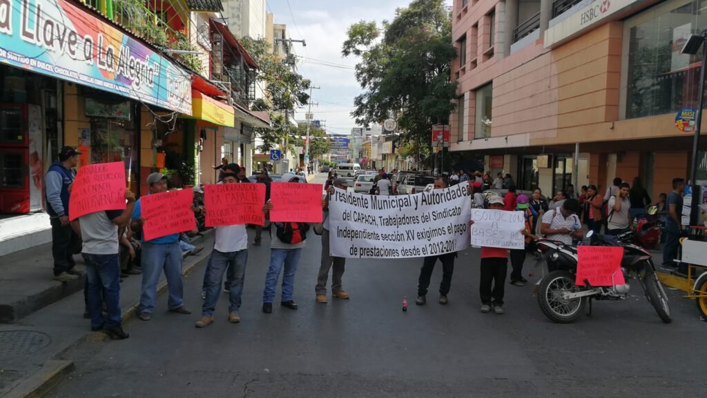 Trabajadores de la Comisión de Agua Potable y Alcantarillado de Chilpancingo (Capach), bloquearon por más de cinco horas el centro de la ciudad para exigir el pago de la segunda parte de su aguinaldo y la segunda quincena de enero.